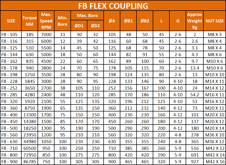 Product Name : FB-Flex Coupling – FB Series Torque Range : 185 Nm to 86,785 Nm Speed Capacity : 750 to 7000 RPM Bore Range : 11 mm to 305 mm Weight Range : 2.0 kg to 927 kg
