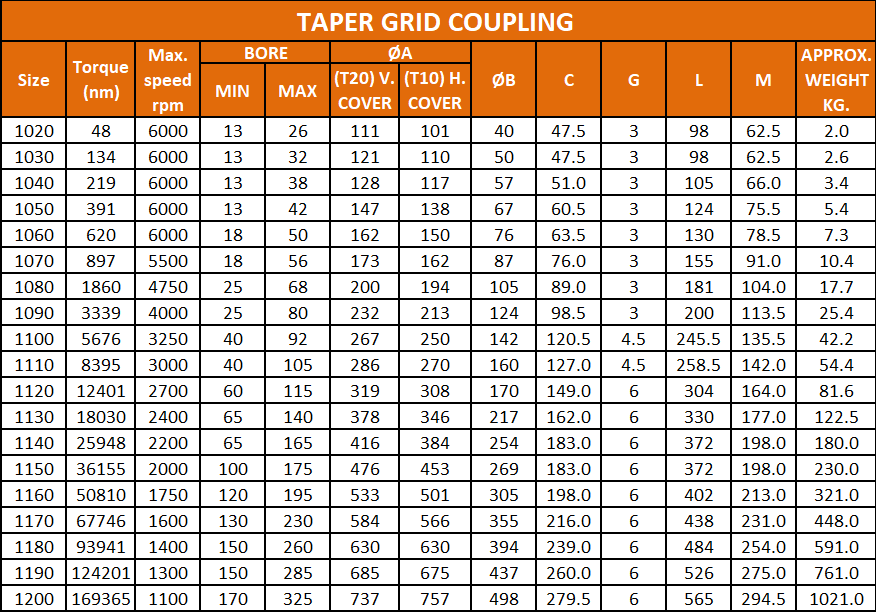 Product Name: Taper Grid Coupling Capacity: High torque transmission with shock-load resistance Max Speed: Suitable for high RPM operations