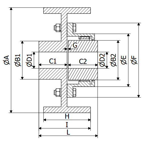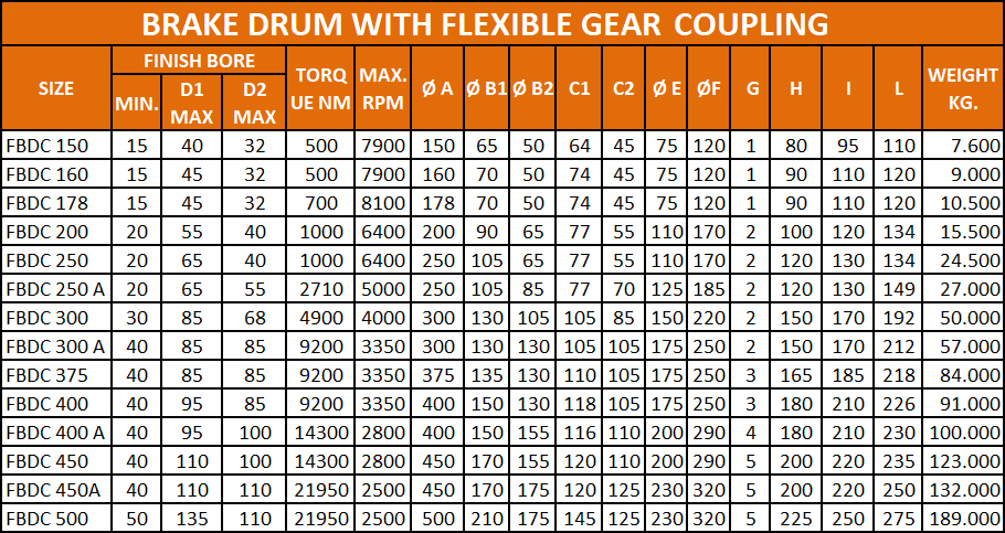 Product Name : FBDC (Brake Drum with Flexible Geared Coupling) Capacity : 21950 Nm / 100 rpm Max Bore : 130 mm (D1) / 120 mm (D2)