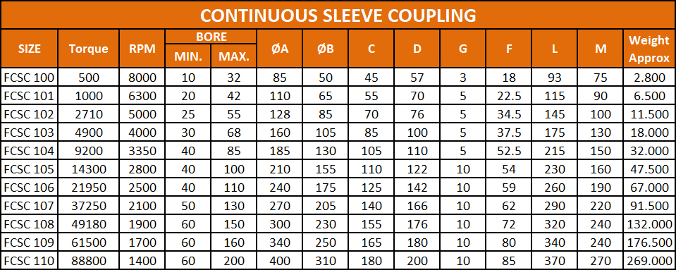 Product Name : FCSC (Continuous Sleeve Coupling) Capacity : 88800 Nm / 100 rpm Max Bore : 210 mm